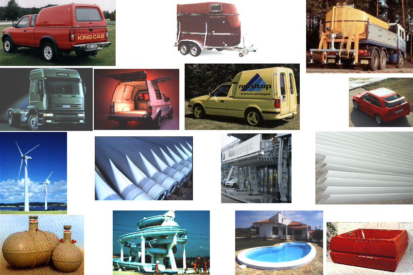 Из стеклопластиков производят следующие изделия: оконные и другие профили, бассейны, купели, водные аттракционы, лодки, каноэ, таксофонные кабины, кузовные панели и обвесы для грузовых и легковых автомобилей, электронепроводящие лестницы и штанги для работ в опасной близости от конструкций под напряжением.